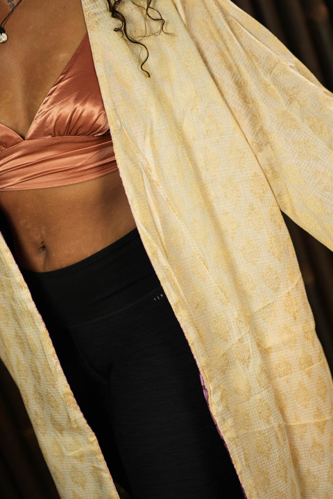 Auf der einen Seite finden Sie den farbenfrohen Vintage-Sari, den wir am liebsten wiederverwenden – weil er so schön ist – und auf der anderen Seite etwas anderes Cooles, das wir während unserer Abenteuer bei der Bergung vergessener Materialien gefunden haben: alte Vorhänge, ausgemusterte Bettlaken , oder dieses coole Abfallmaterial, das wir aus Hochdruckateliers sammeln.
