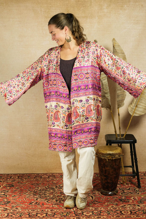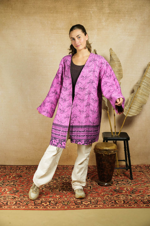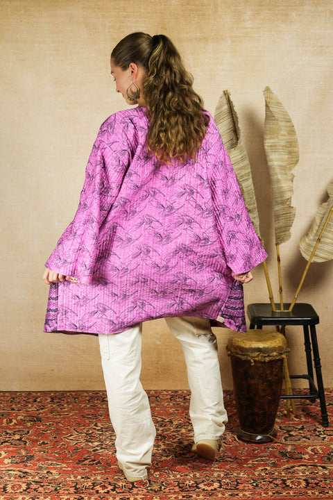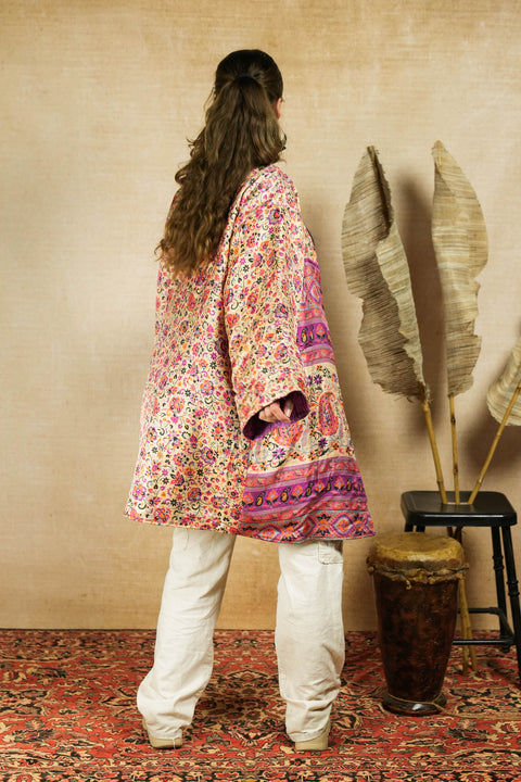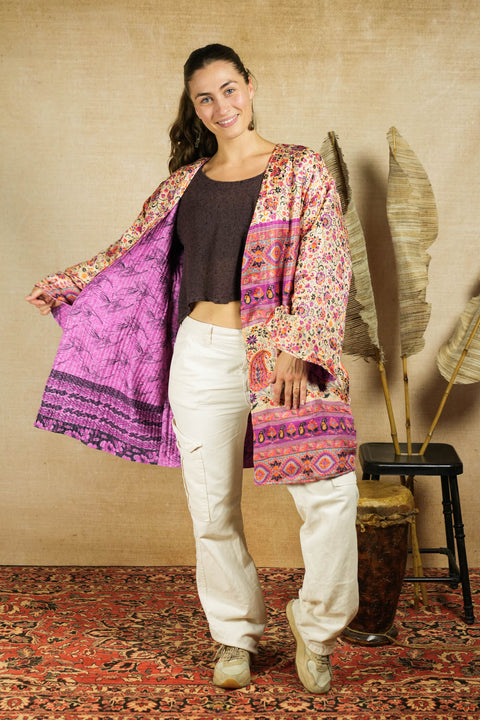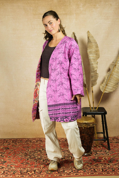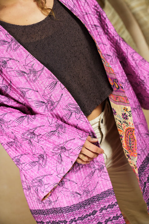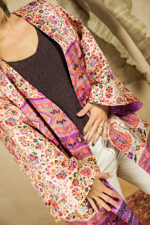 On the one side you find the colourful vintage saree, which is our favourite material to repurpose - because they’re so beautiful - and on the other side something else cool we’ve found during our adventures salvaging forgotten materials: old curtains, rejected bedsheets, or this cool waste material we collect from blockprinting ateliers. This version of our jacket Kalon is padded. which makes it extra warm and suitable as a coat.