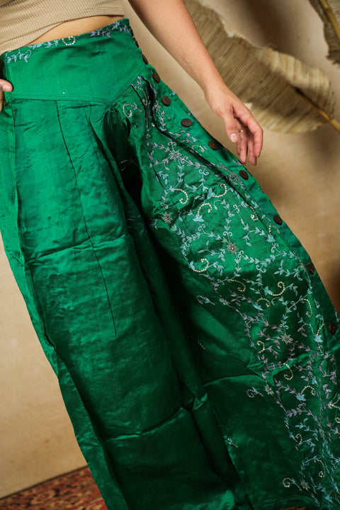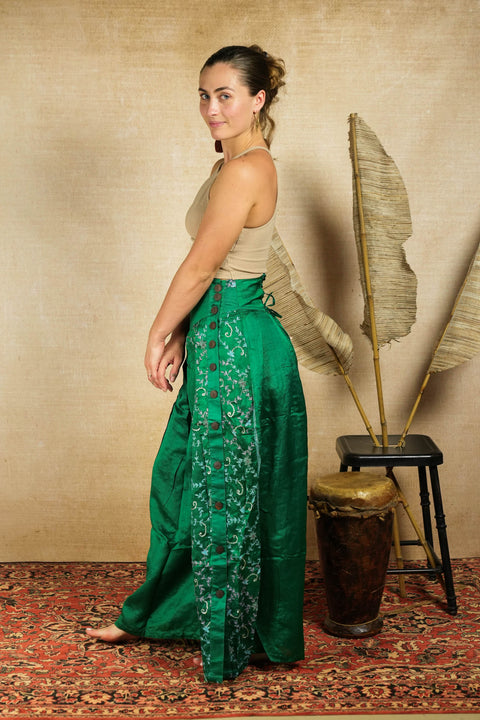 These 'Hygge' trousers are exactly the same as our original 'Hygge' design, except that these are fully made from vintage Indian Sari's, our absolute favourite fabrics to recycle. This makes them more airy and thus a great fit for the sun splashed, warm temperatures kind of days.