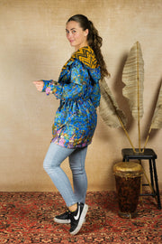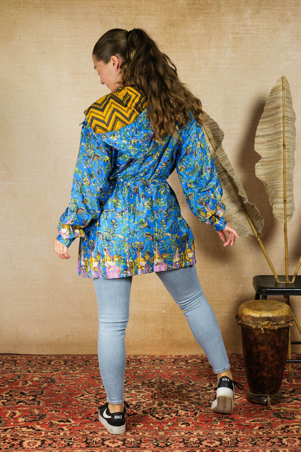 A parka jacket made from materials without purpose; beautiful forgotten fabrics that we have found and transformed to unique wearable pieces of art like this one right here. A jacket made for epic adventures 'on the fly'. Just pop your parka on for some extra color.