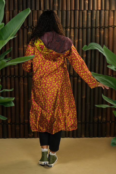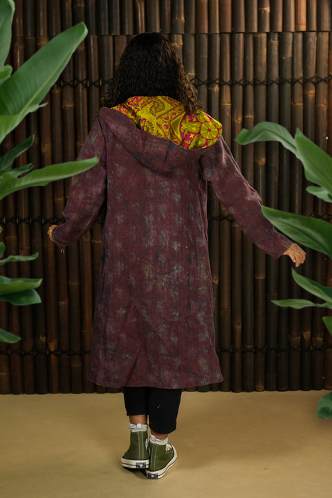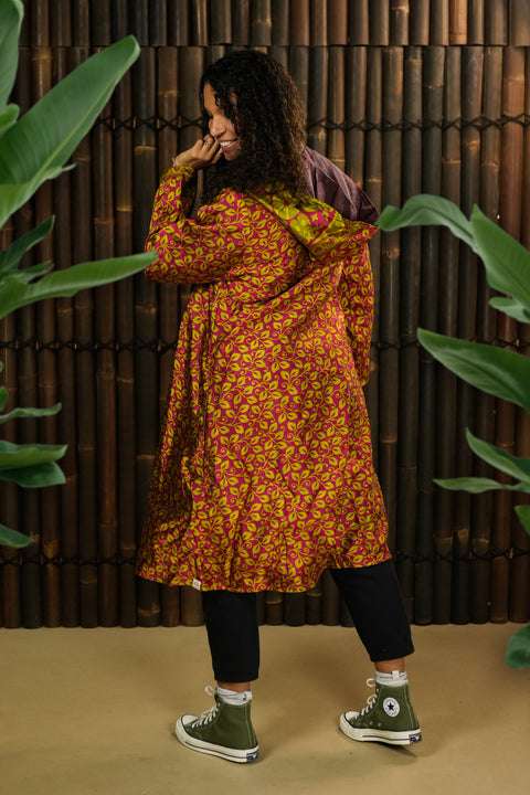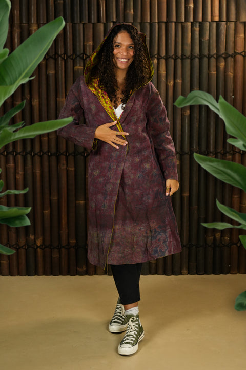 Een episch omkeerbaar jack gemaakt van materialen zonder doel; prachtige vergeten stoffen die we hebben gevonden en getransformeerd tot unieke draagbare kunstwerken zoals deze hier. Ook rockt hij een fantastische grote capuchon, heeft een brede mooie riem en zakken aan beide kanten: binnen en buiten.