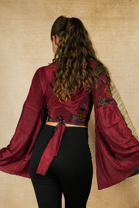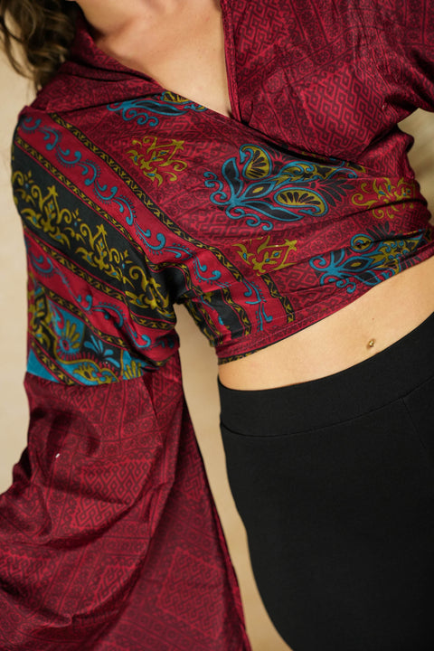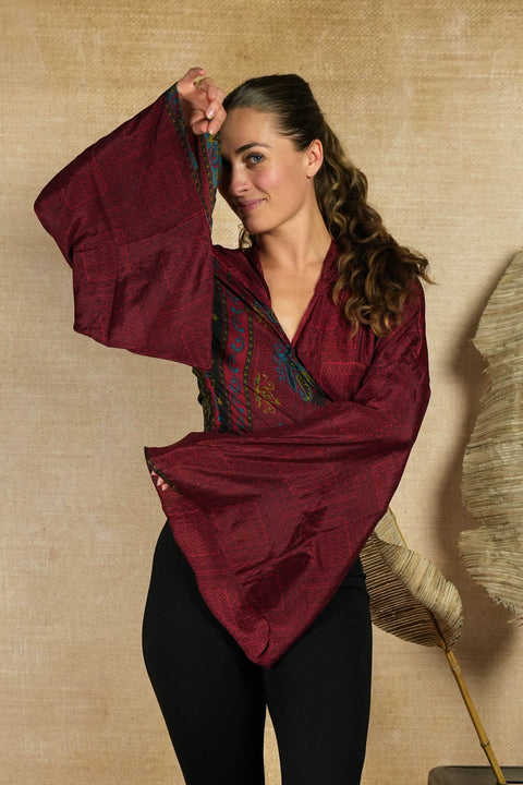 Deze top is gemaakt om in te bewegen. Met haar prachtige vloeiende hergebruikte zijdeachtige stoffen - zonder wormen, beloofd - en epische mouwen, verander je elke saaie oude ruimte in een plek waar mensen rozen tussen hun tanden houden.