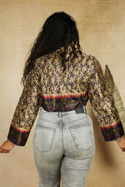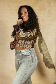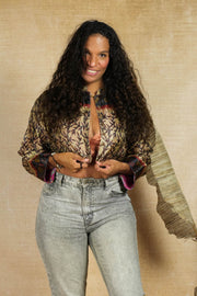 Omdat dit kledingstuk is gemaakt van gerecyclede vintage en tweedehands stoffen die we zelf van over de hele wereld verzamelen, is het erg moeilijk om de exacte samenstelling te bepalen van elke stof die we hergebruiken. We hopen dat je ons dit kunt vergeven. Dat gezegd hebbende, de meeste stoffen die we gebruiken zijn ofwel Viscose of Rayon.