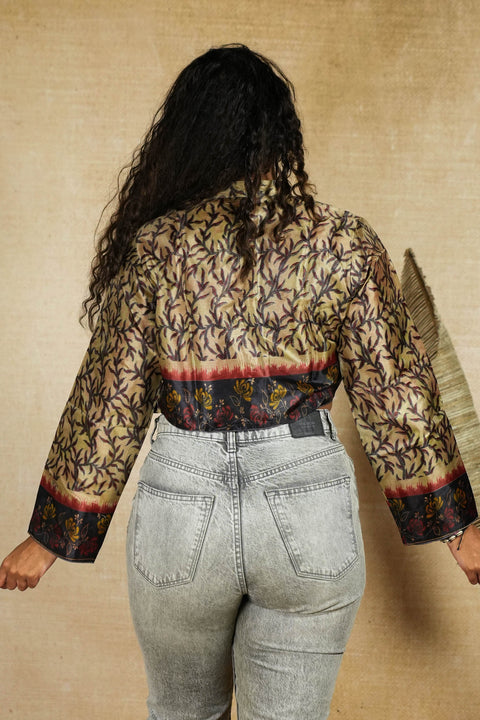 Aan de buitenkant van Yügen vind je een kleurrijke vintage sari, ons favoriete materiaal om te hergebruiken, en we hebben het aan de binnenkant bekleed met een andere hergebruikte stof; iets cools dat we hebben gevonden tijdens onze avonturen bij het bergen van vergeten materialen: oude gordijnen, afgekeurde lakens, epische sjaals of dit coole afvalmateriaal dat we verzamelen bij blokdrukateliers.