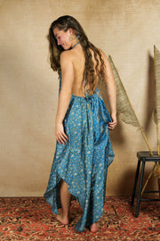 Dit is een lange jurk met een hoge hals en een prachtige open rug. We hebben hem gemaakt met trekkoorden, waarmee je de achterkant van de jurk omhoog kunt trekken om de lengte aan te passen. Hierdoor kunnen vrouwen van alle lengtes deze beauty dragen. - we zijn erg trots op het bedenken van deze handige oplossing.