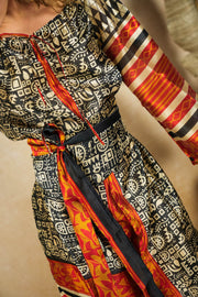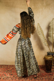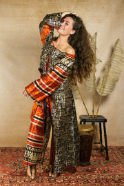 Omdat dit kledingstuk is gemaakt van gerecyclede vintage en tweedehands stoffen die we zelf van over de hele wereld verzamelen, is het erg moeilijk om de exacte samenstelling te bepalen van elke stof die we hergebruiken. We hopen dat je ons dit kunt vergeven. Dat gezegd hebbende, de meeste stoffen die we gebruiken zijn ofwel Viscose of Rayon.