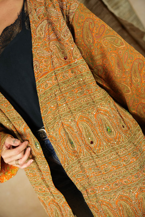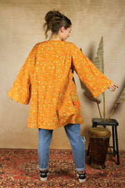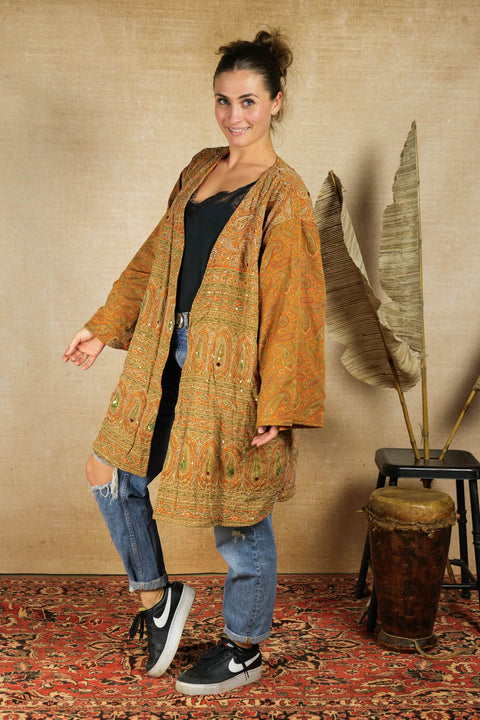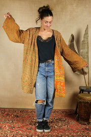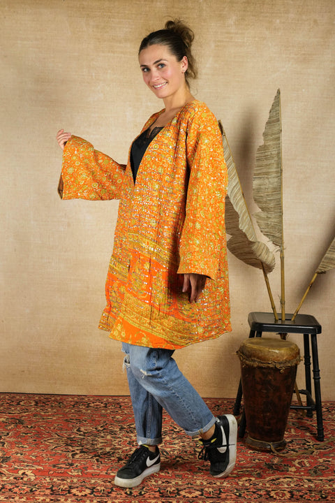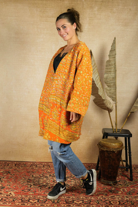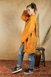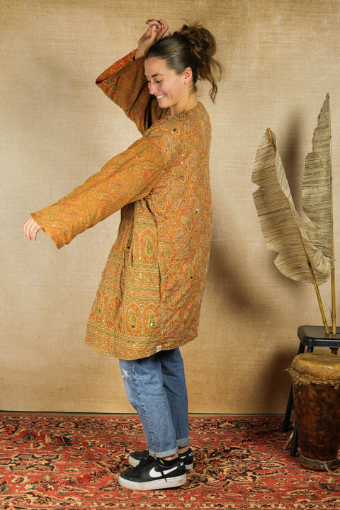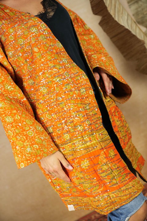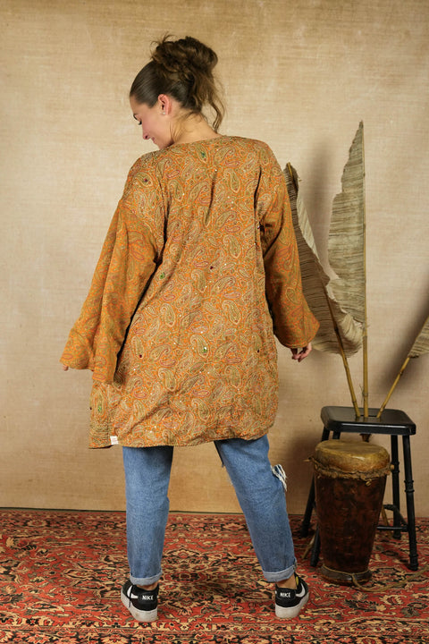 Aan de ene kant vind je de kleurrijke vintage sari, ons favoriete materiaal om te hergebruiken - omdat ze zo mooi zijn - en aan de andere kant iets anders cools dat we tijdens onze avonturen hebben gevonden bij het redden van vergeten materialen: oude gordijnen, afgekeurde lakens , of het toffe afvalmateriaal dat we ophalen bij blokdrukateliers. Dit is een gewatteerde variant van onze jas Kalon wat hem iets warmer maakt en dus perfect als tussenjas.