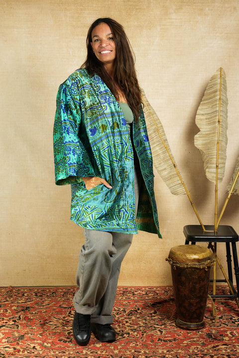A reversible jacket with the most epic of sleeves and with pockets, made from repurposed salvaged fabrics. ✨