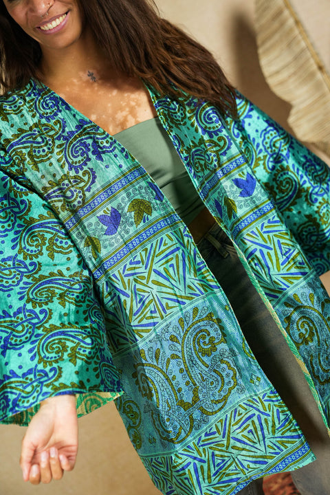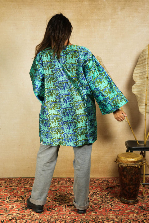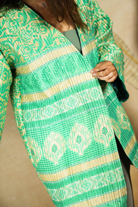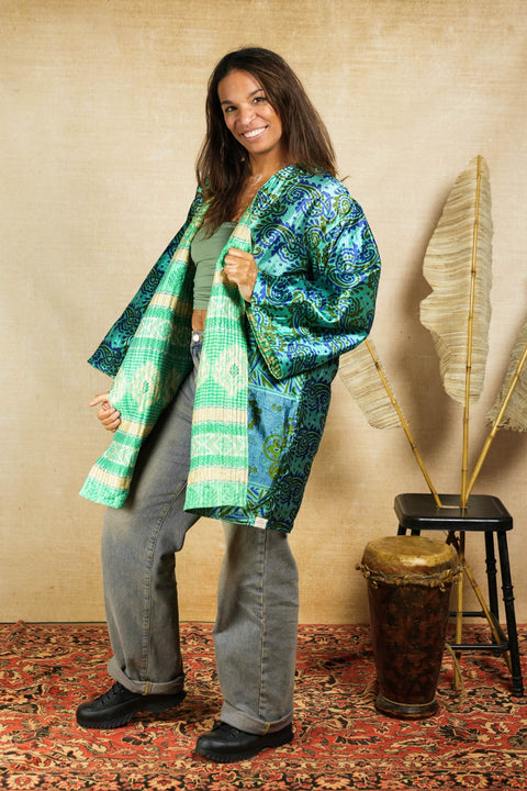On the one side you find the colourful vintage saree, which is our favourite material to repurpose - because they’re so beautiful - and on the other side something else cool we’ve found during our adventures salvaging forgotten materials: old curtains, rejected bedsheets, or this cool waste material we collect from blockprinting ateliers. This version of our jacket Kalon is padded. which makes it extra warm and suitable as a coat.