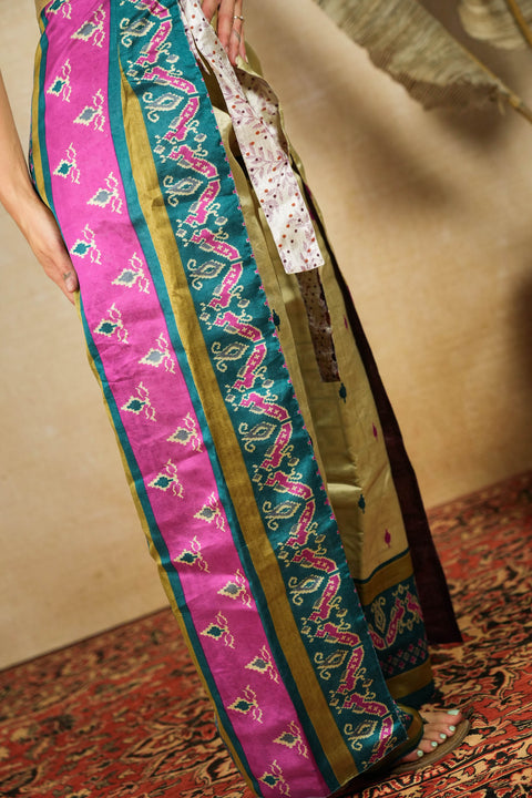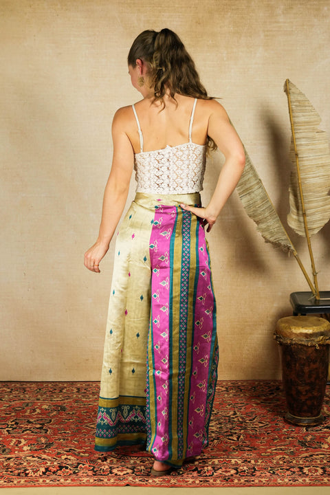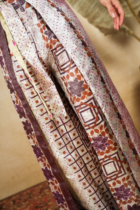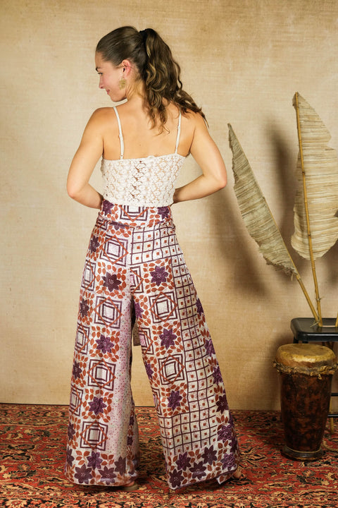 Je kunt deze broek aan beide kanten wikkelen en aan elk van deze kanten vind je een andere mooie hergebruikte stof.
