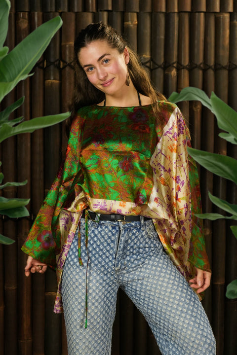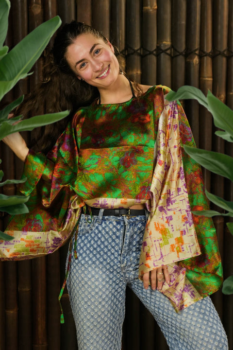 Dit ontwerp rockt epische kimono-achtige wijde mouwen, waardoor elke beweging eruitziet als een vloeiend kunstwerk. We hebben een trekkoord door de onderkant van de top geregen waarmee je de pasvorm van de top kunt aanpassen. Draag hem los en relaxed of crop hem een ​​beetje om je mooie taille te accentueren!