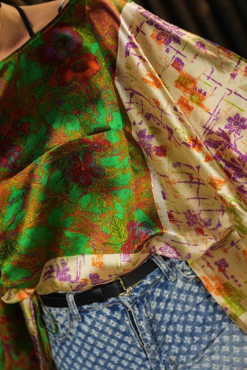 Omdat dit kledingstuk is gemaakt van gerecyclede vintage en tweedehands stoffen die we zelf van over de hele wereld verzamelen, is het erg moeilijk om de exacte samenstelling te bepalen van elke stof die we hergebruiken. We hopen dat je ons dit kunt vergeven. Dat gezegd hebbende, de meeste stoffen die we gebruiken zijn ofwel Viscose of Rayon.