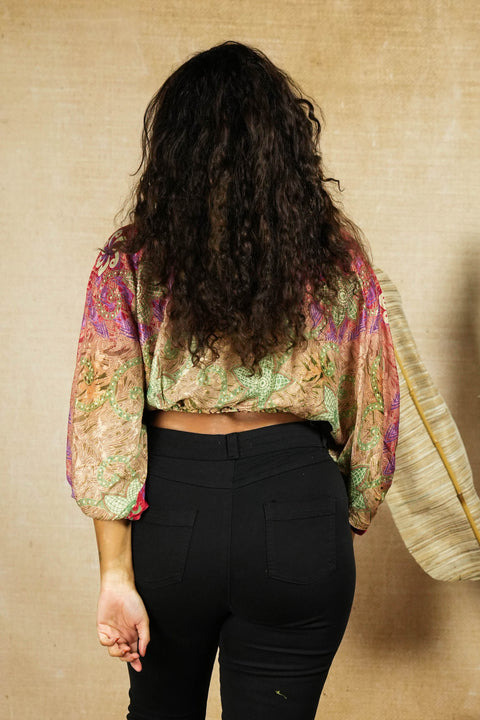Ze is een ruime crop top en heeft een elastische band aan de onderkant en het uiteinde van de mouwen voor een poofy wolkeffect. Ook al ziet ze er casual uit, haar wijde mouwen bewegen je met een zekere stijlvolle groove die de neiging heeft om iedereen weg te blazen!