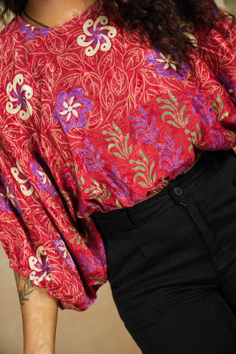 Omdat dit kledingstuk is gemaakt van gerecyclede vintage en tweedehands stoffen die we zelf van over de hele wereld verzamelen, is het erg moeilijk om de exacte samenstelling te bepalen van elke stof die we hergebruiken. We hopen dat je ons dit kunt vergeven. Dat gezegd hebbende, de meeste stoffen die we gebruiken zijn ofwel Viscose of Rayon.