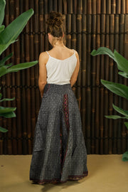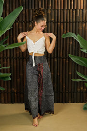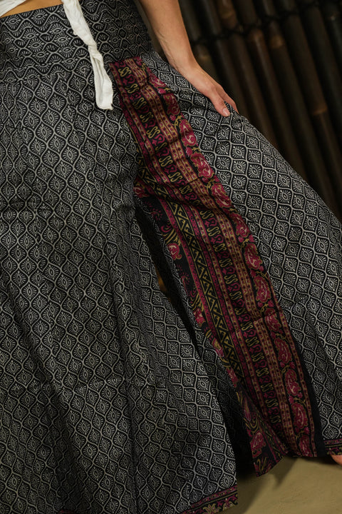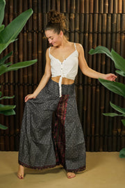Deze broek is prachtig, met wijde lange pijpen en handgemaakt van hergebruikte stoffen die we van over de hele wereld verzamelen.