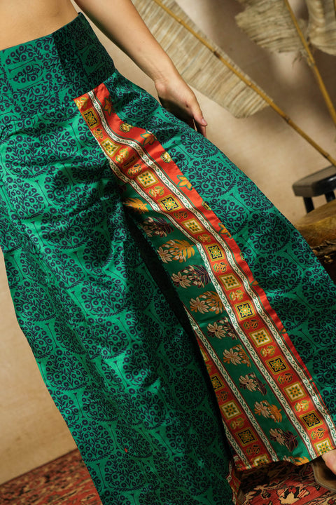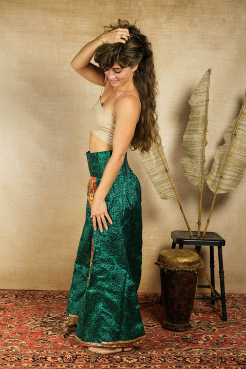 Deze broek is prachtig, met wijde lange pijpen en handgemaakt van hergebruikte stoffen die we van over de hele wereld verzamelen.