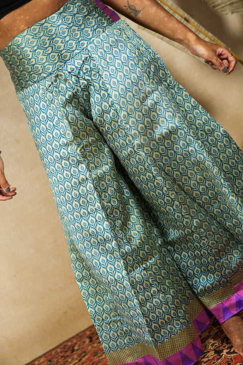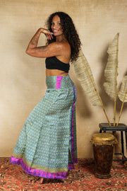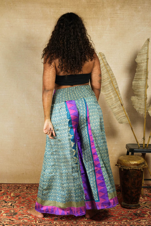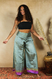 Deze broek is prachtig, met wijde lange pijpen en handgemaakt van hergebruikte stoffen die we van over de hele wereld verzamelen.