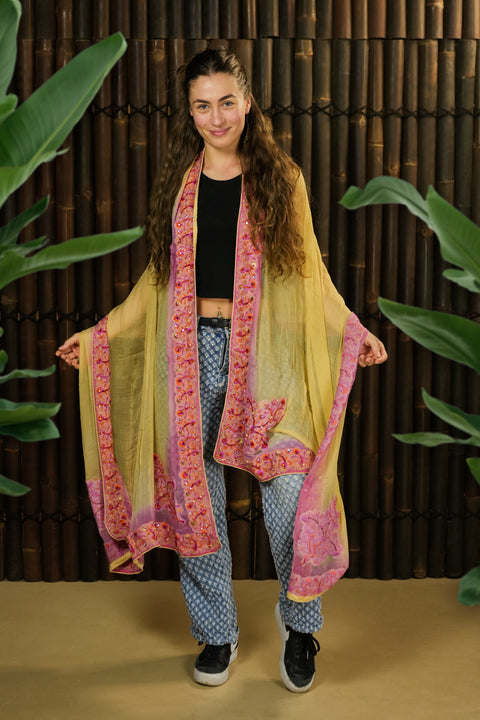 Deze antieke sjaal is gemaakt voor koninginnen! We vonden deze schoonheid in een kleine winkel in Pushkar; een heilige stad in India midden in de woestijn, waar ze deze oude Bollywood-sjaals verkochten. Wat een vondst!