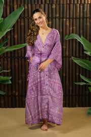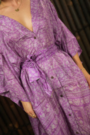 This piece can be worn either as a jacket when let loose or as a dress when buttoned up. It comes with a wide belt that allows you to center the fabric the way that serves your body best. It has two slits either side that give a playful twist to the rich bohemian charm that this piece carries.  Not to forget, it has pockets too!