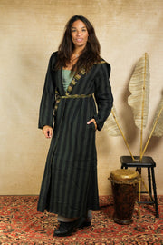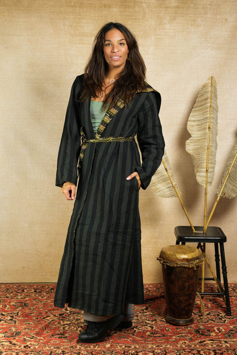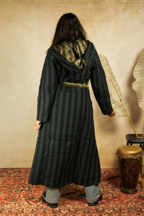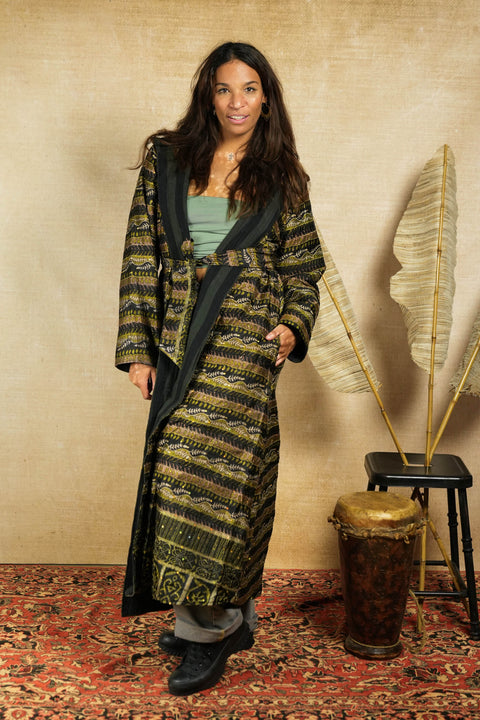 An epic reversible jacket made from materials without purpose; beautiful forgotten fabrics that we have found and transformed to unique wearable pieces of art like this one right here. Isa rocks a fantastic huge hood, has a wide beautiful belt and pockets on both sides: inside and out.