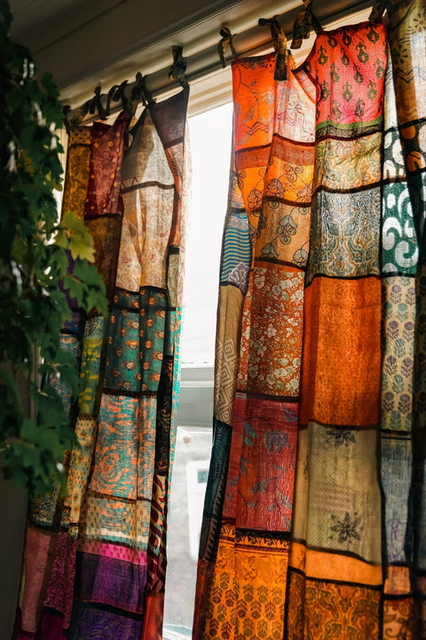 These Beautiful curtains are made of leftover fabric that have been cut off the pieces of clothing. Like this we really use every last bit of fabric so every curtain is unique. Yay for sustainable interior! The back of the curtain has 4 large horizontal steps of saree, you can turn them around for a total different look!