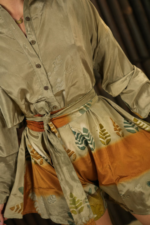 Samar has cute coconut buttons and a wide belt to center that gorgeous soft fabric along your body with.