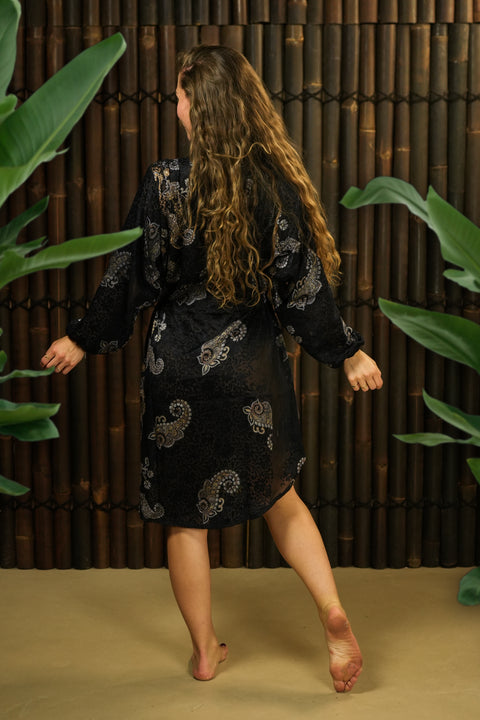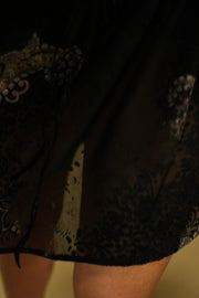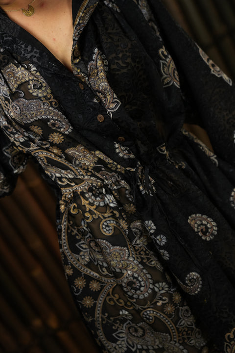This dress has a lot of beautiful details like an asian collar, coconut buttons, a waist belt and around the shoulders on the back side of the dress it has some finely stitched pleated lining details. Of course this piece is too made from unique recycled fabrics; either viscose or rayon.